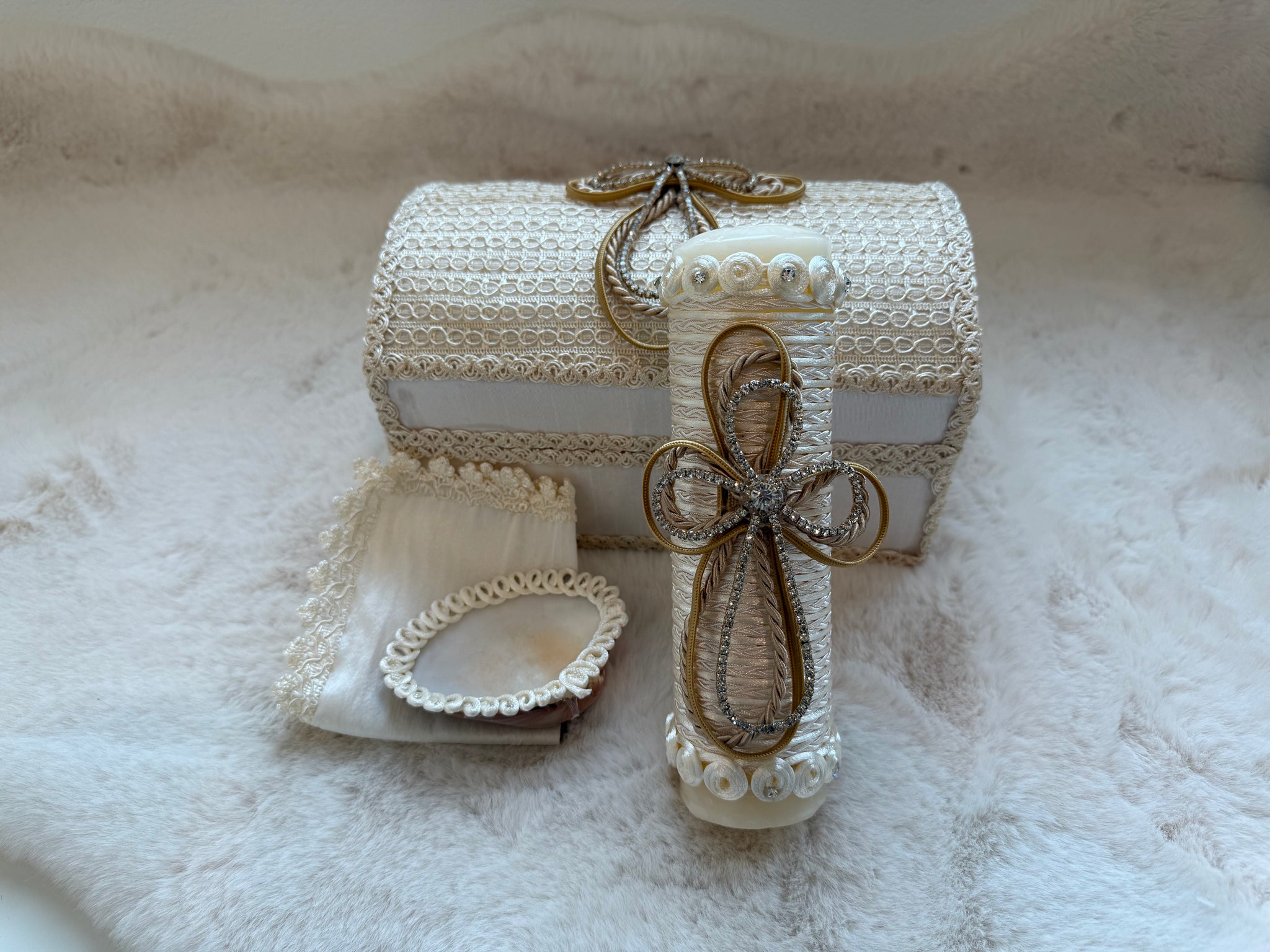 The coordinating baptism candle mirrors the box with matching lace, rhinestone accents, and warm neutral tones. Designed to complement ivory, off-white, beige, or champagne baptism gowns, this set offers a refined and classic presentation for the sacrament of Baptism.