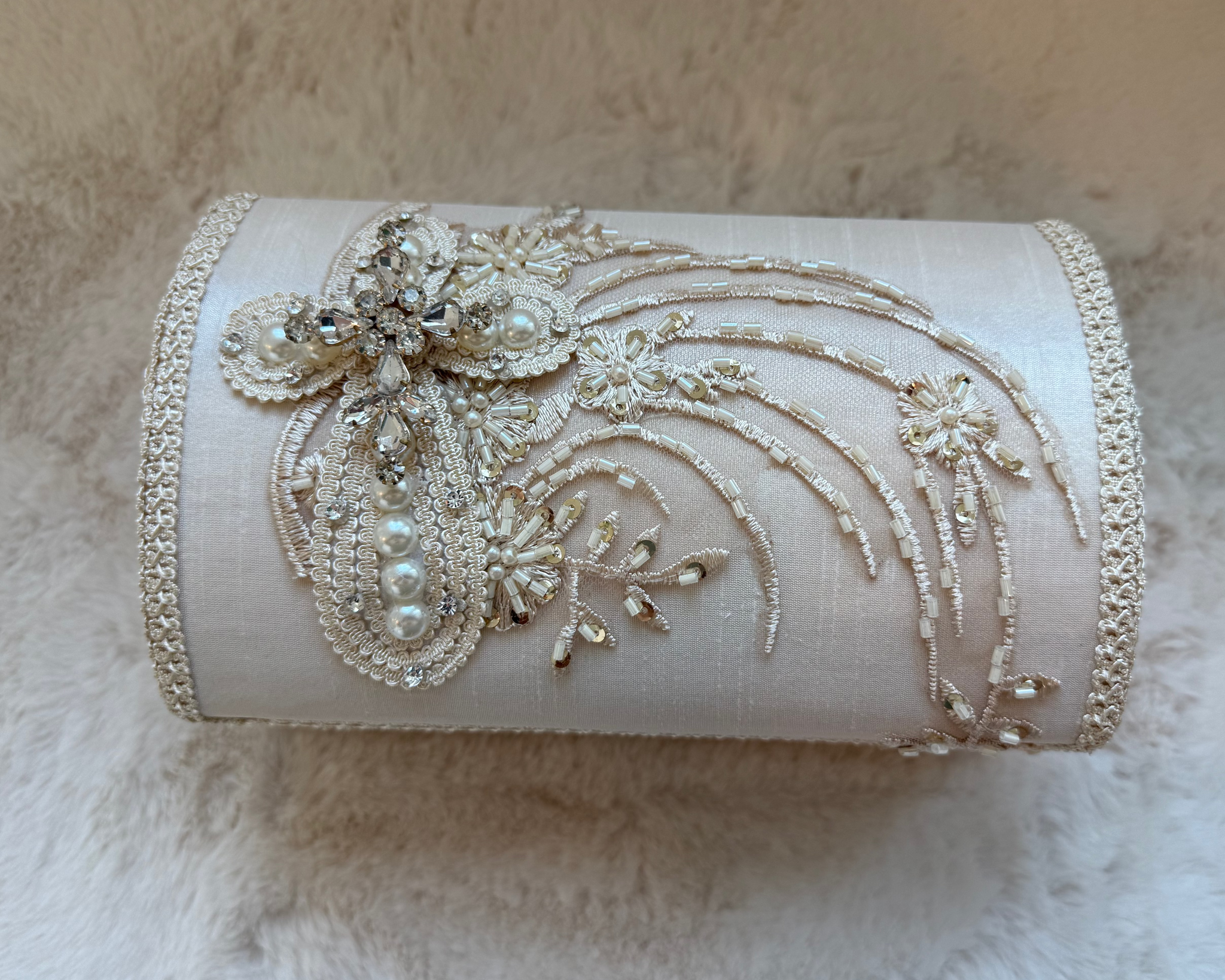 The coordinating candle completes the set with matching lace and crystal embellishments. Its soft ivory palette makes it ideal for off-white, ivory, or neutral baptism gowns.